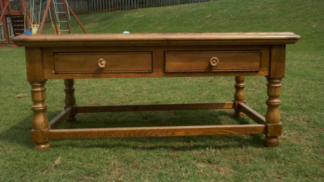 Once upon a time, there was a sad, sad little coffee table with a broken knob sitting in the back of a going-out-of-business furniture warehouse on the side of the highway. It was all alone, collecting dust with a $100 price tag (what?). And it was orange and ugly, but wait… solid wood… nice lines. I like the plank style of the top. And the turned legs. Hm. “Would you take $20 for it?” (It didn’t hurt that I was also buying $600 worth of couches.)