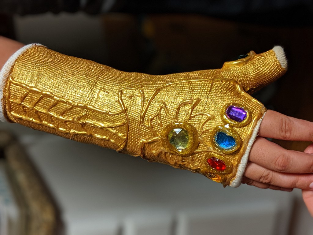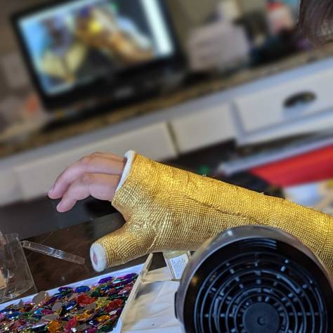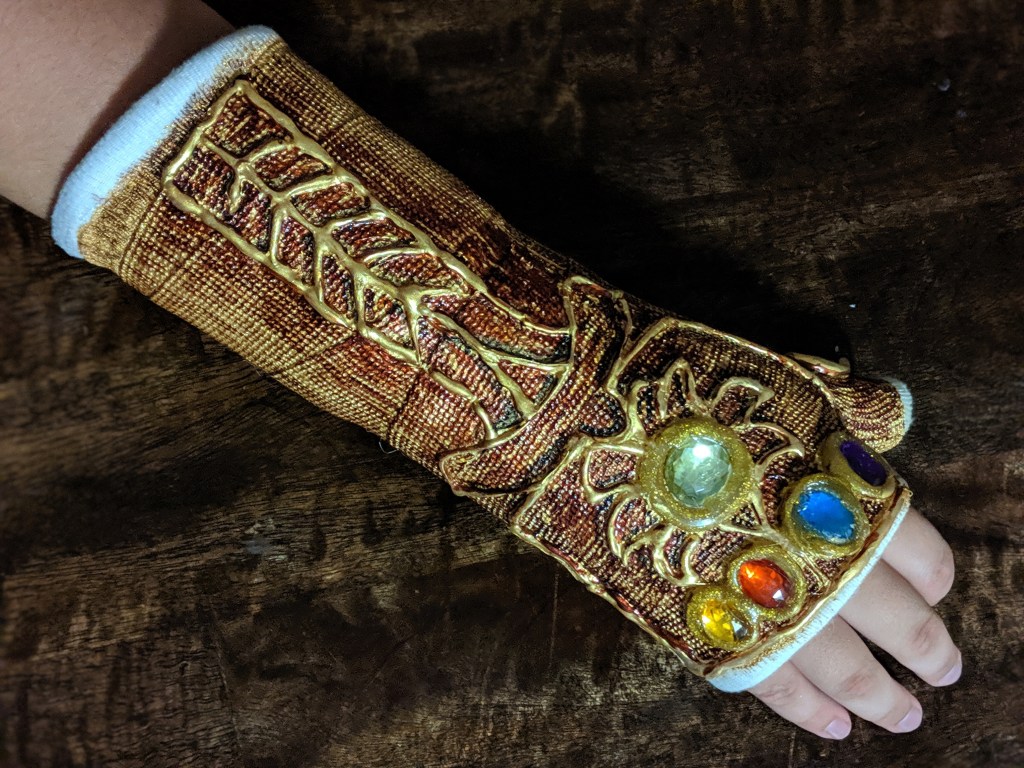 Next was the hardest part: the design. I’m not the most accurate artist, so trying to get a precise line with a glue gun was not really an option, but I did the best I could. After that dried, we put on another coat of paint so the glue would match the rest of the cast … er, I mean gauntlet. (I happened to have a stick of gold glue so I put a border around each gem, but you can skip that step.)